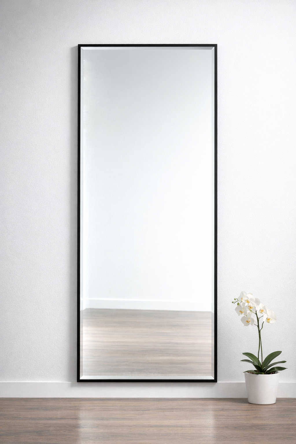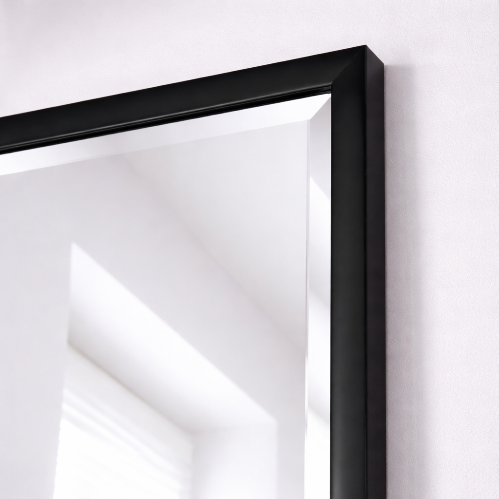 Lustrzana tafla na krańcach fazowana na 15mm. Lustro umieszczone w czarnej ramie aluminiowej, pomalowanej metodą proszkową.