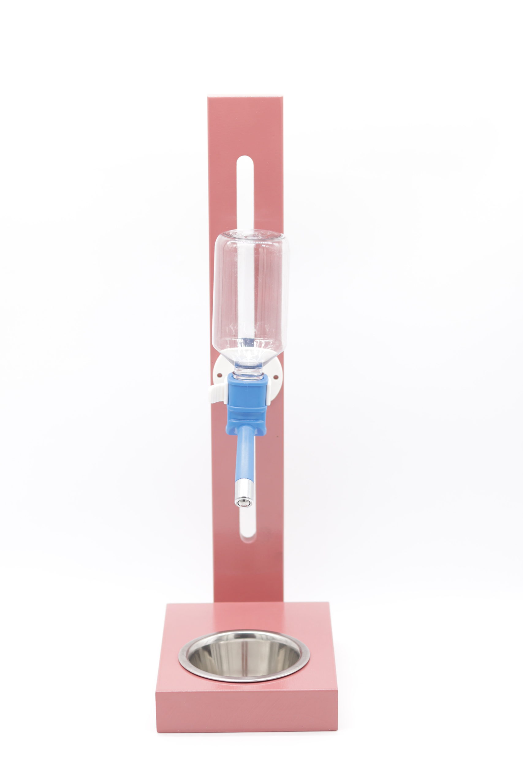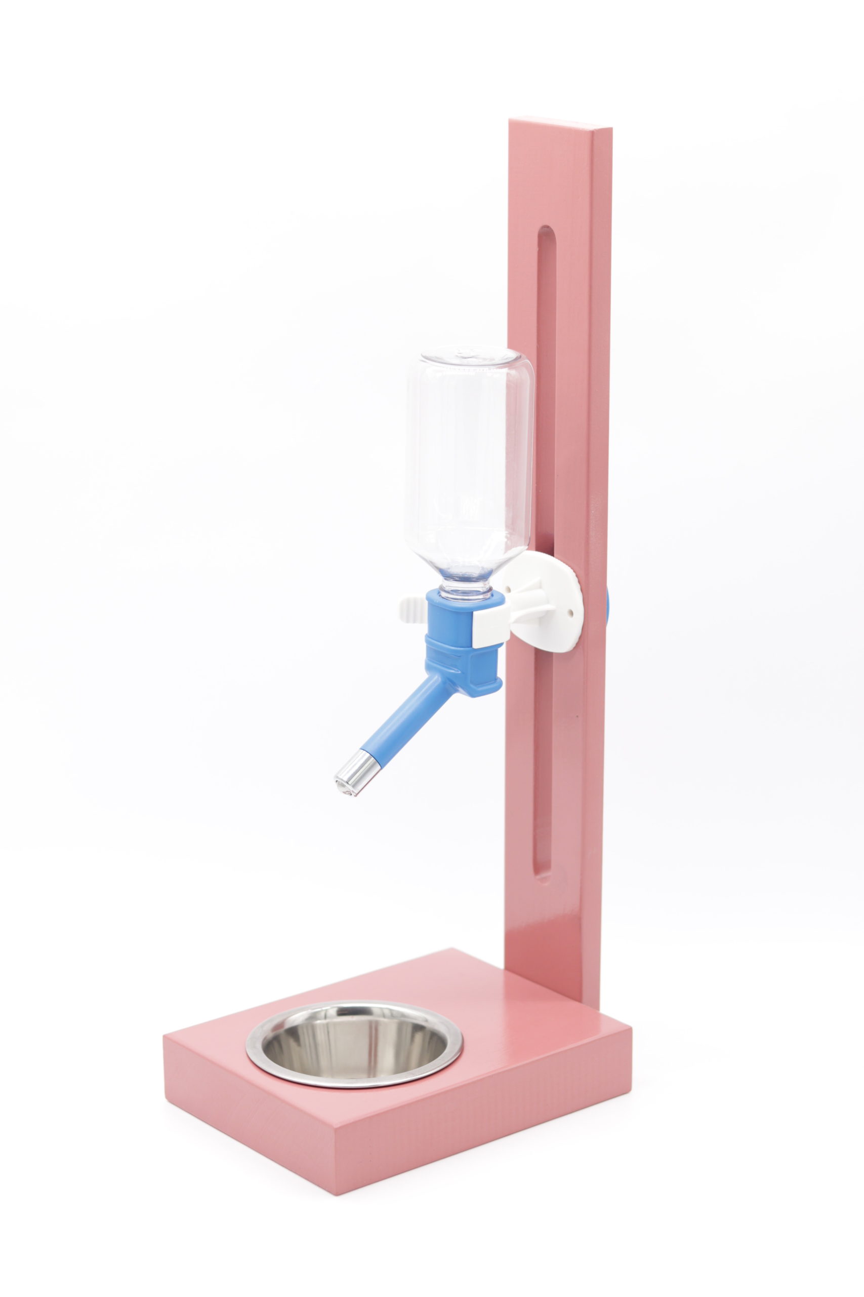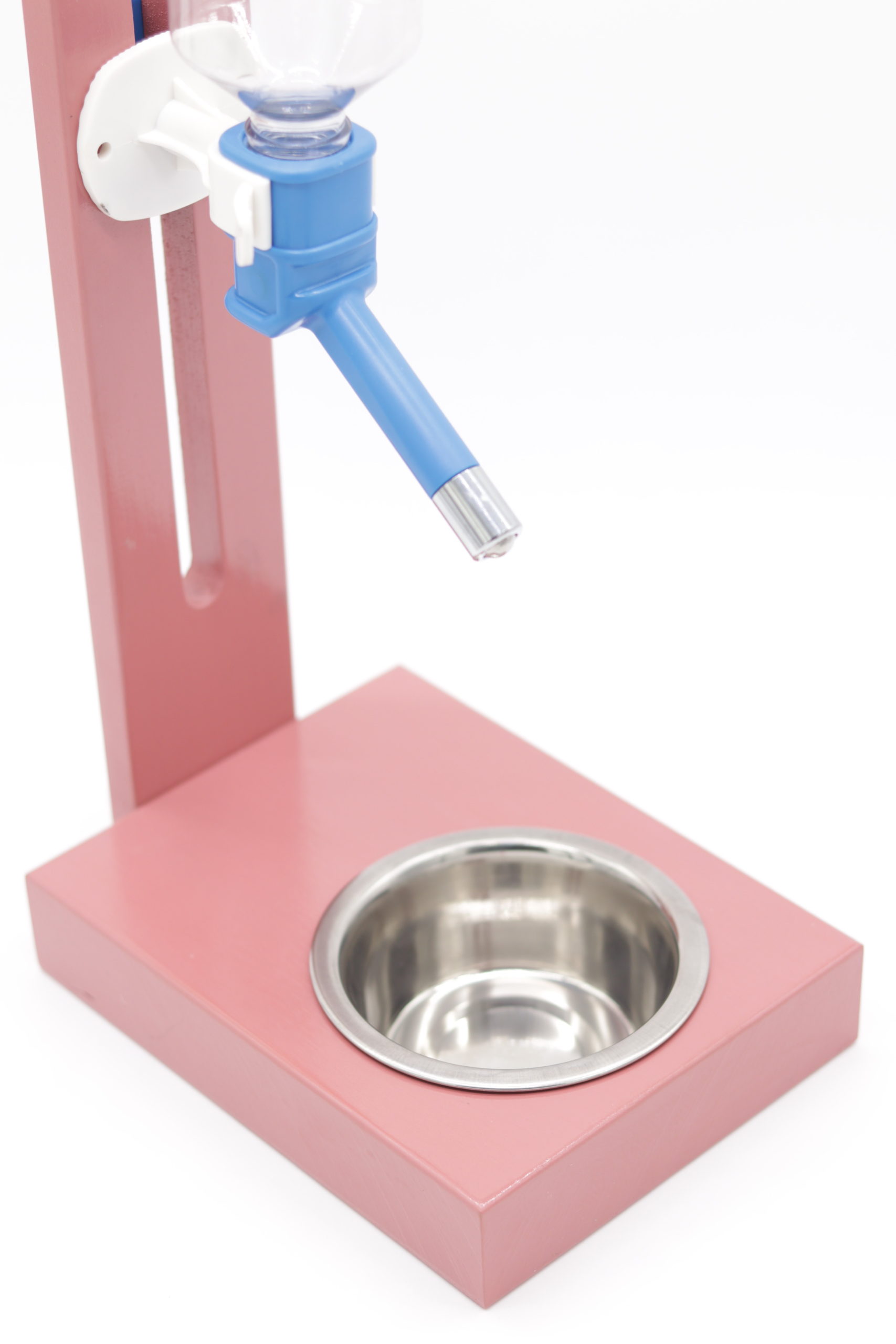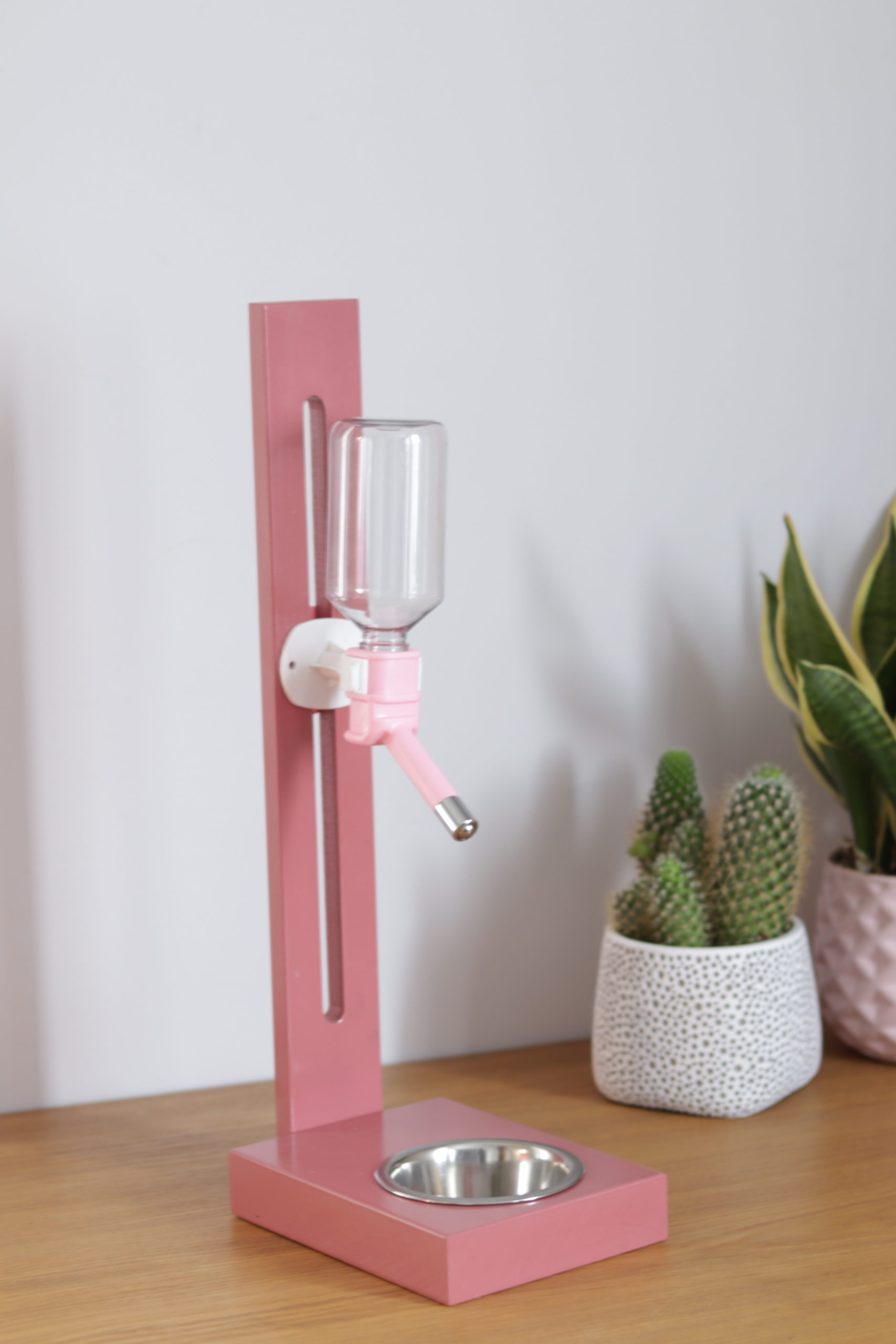 Różowe poidło na stojaku drewnianym